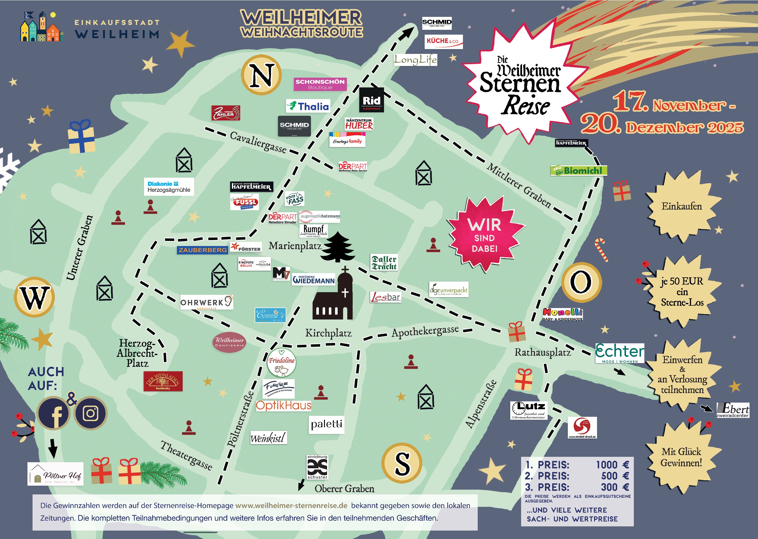 Die 11. Weilheimer Sternenreise hat begonnen. In diesem Jahr findet die Aktion der Einzelhändlerinnen und Einzelhändler der Weilheimer Innenstadt von Montag, 17.November bis Samstag, 20. Dezember 2025 statt. Das Motto lautet auch heuer wieder: Einkaufen dahoam - ein Gewinn für alle!