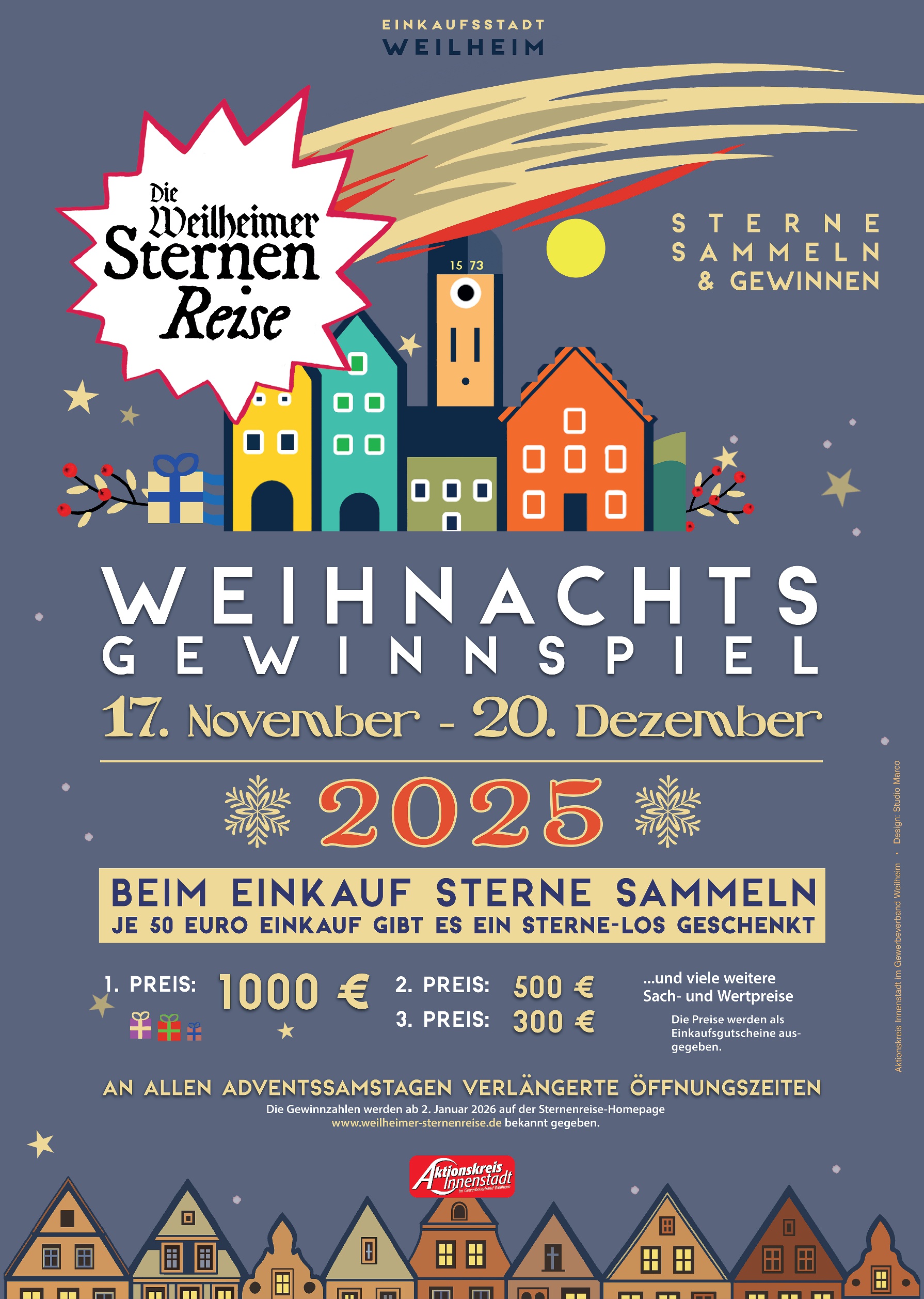 Die 11. Weilheimer Sternenreise hat begonnen. In diesem Jahr findet die Aktion der Einzelhändlerinnen und Einzelhändler der Weilheimer Innenstadt von Montag, 17.November bis Samstag, 20. Dezember 2025 statt. Das Motto lautet auch heuer wieder: Einkaufen dahoam - ein Gewinn für alle!